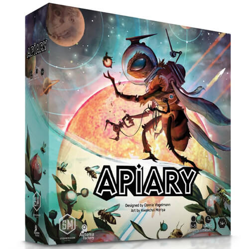 In Apiary, each player controls one of twenty unique factions. Your faction starts the game with a hive, a few resources, and worker bees. A worker-placement, hive-building challenge awaits you: explore planets, gather resources, develop technologies, and create carvings to demonstrate your faction’s strengths (measured in victory points) over one year’s Flow. However, the Dearth quickly approaches, and your workers can take only a few actions before they must hibernate! Can you thrive or merely survive?