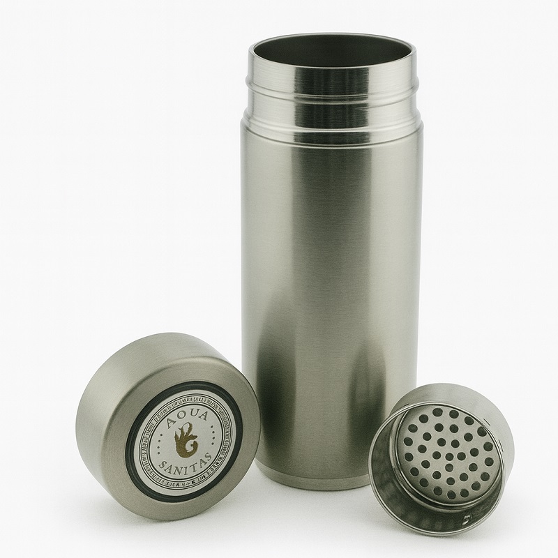 AQUA SANITAS е иновативно шише за вода со вградени минерални филтри кое ја претвора обичната вода за пиење во минерално збогатена, алкална и подобро хидратантна вода за телото. За само 5–10 минути, минералите во шишето: