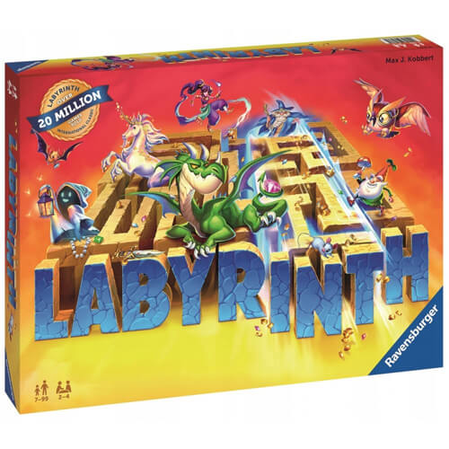 Part of the Ravensburger Labyrinth Games series. Lay square labyrinth cards showing fantasy symbols like a griffin, dragon, scroll, key, gems, etc. When a symbol on the card you just laid is directly connected to one or more identical symbols on other cards, you can take those cards (but not the one you just laid), as long as the labyrinth does not become disjointed. You only hold 2 cards and draw after laying. The game ends when the draw pile is finished, most cards collected wins. A children’s game that is fun enough as a filler for adults.
