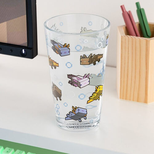 The 400ml (14 fl oz) capacity drinking glass features a repeated pattern of pink leucistic, brown wild, yellow gold, and blue axolotls from the game. With the design wrapped around the glass, you can enjoy a splash of Minecraft with every sip.