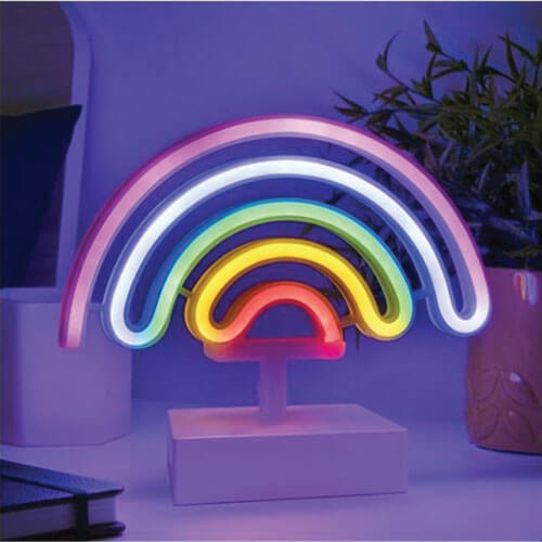 Neon style LED lamp of a rainbow with table support and USB charging.