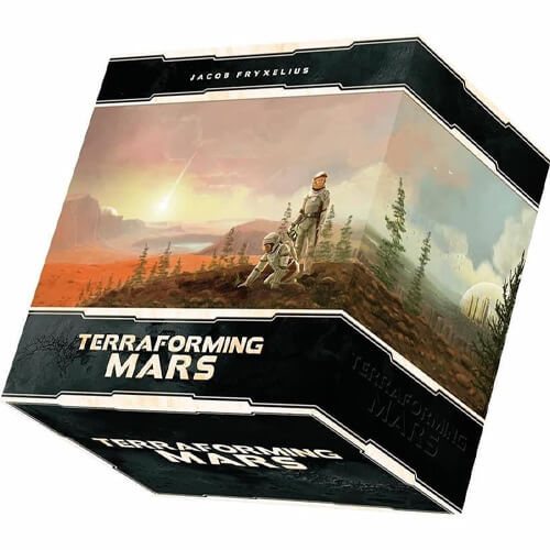 Terraforming Mars: Big Box is both a storage option for all the Terraforming Mars material released to date — the base game, five expansions, and the first-player rover — and a set of 3D terrain tiles to dress up the game. Included in the box are: