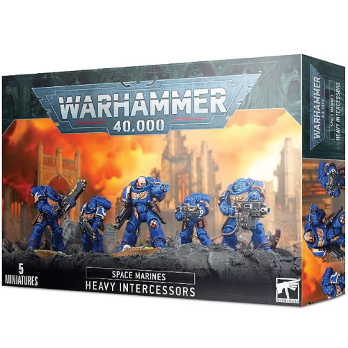 This 120-part plastic kit makes five Heavy Intercessors and is supplied with five Citadel 40mm Round Bases. The entire squad can be equipped with heavy bolt rifles, Hellstorm bolt rifles, or Executor bolt rifles, and a single member can be upgraded to carry a heavy bolter, Hellstorm heavy bolter, or Executor heavy bolter. The box also includes a Space Marines transfer sheet.