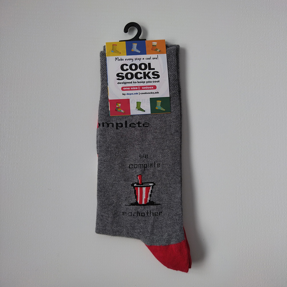 Со забавен и уникатен дизајн инспириран од незаменливото дуо помфрит и освежувачко пијалок, чорапите We complete each other се идеални за оние кои сакаат да го покажат својот карактер и љубов кон вкусните комбинации.