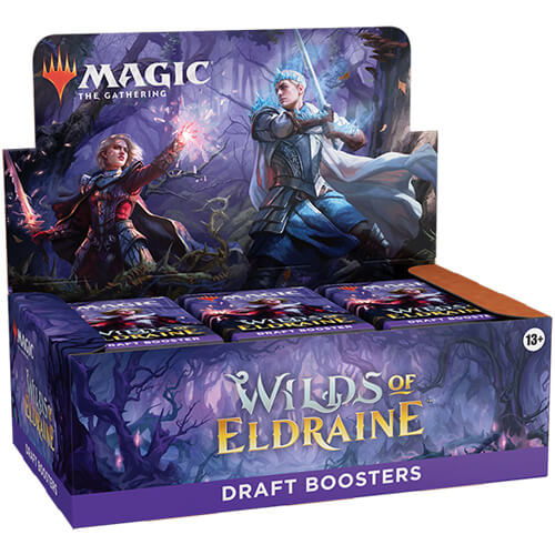 This Wilds of Eldraine Draft Booster Box contains 36 Wilds of Eldraine Draft Boosters. Each Draft Booster contains 15 cards and 1 token/ad card, including 1–2 cards of rarity Rare or higher, 3–4 Uncommon, 9 Common, and 1 Land cards (Full-Art Showcase Land in 33% of boosters). Every pack contains at least 1 Enchanting Tales card of rarity Uncommon or higher and a Traditional Foil card of any rarity replaces a Common in 33% of boosters. Traditional Foil Mythic Rare Enchanting Tales card in <1% of boosters.